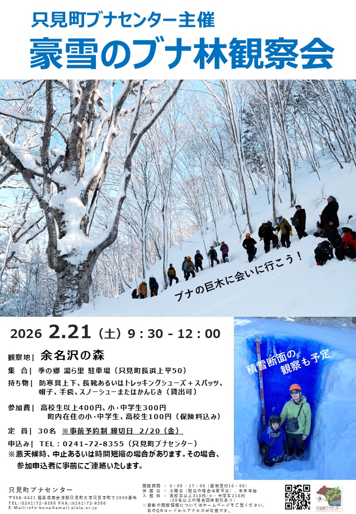 只見町ブナセンターでは2月21日(土)に自然観察会「豪雪のブナ林観察会」を開催いたします。| 日時 | 2026年2月21日(土曜日)9:30-12:00 |